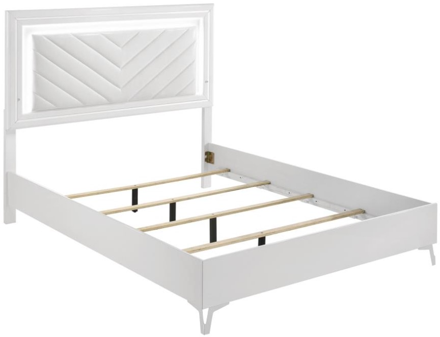 This modern bed showcases a high-gloss white frame paired with a bold LED-lit headboard for striking impact. The panel headboard features a white faux leather insert with chevron channel tufting, framed by a white LED trim that casts soft ambient light.Read More