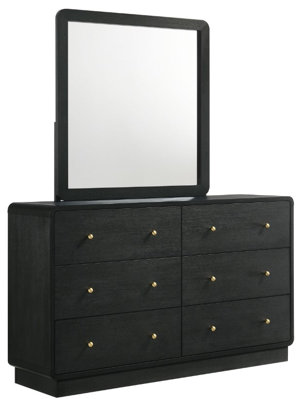 Augment bedroom storage with the plentiful drawer space and stylish presentation of this modern dresser and mirror combination. Its six large drawers facilitate easy organization of clothing and accessories. Each drawer is accentuated with petite ball knobs in a gold finish, offering warmth and contrast.Read More