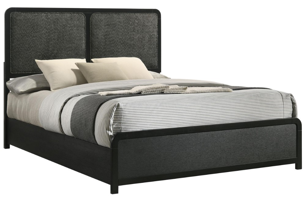 Tailored drama abounds in this modern bed with an upholstered headboard. Its crisp black finish pairs perfectly with charcoal fabric to create a deep, bold focal point for your bedroom. The bed boasts a tall headboard and low footboard, offering airy, open personality.Read More