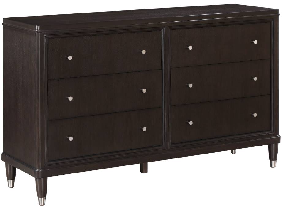 Introduce stylish storage in your bedroom with a modern six-drawer dresser. Its sleek look is accentuated in a dark brown finish, with metallic accents that add depth to tapering feel. Petite knobs decorate each drawer front as drawers offer ample storage for clothing, linens and accessories in your bedroom.Read More