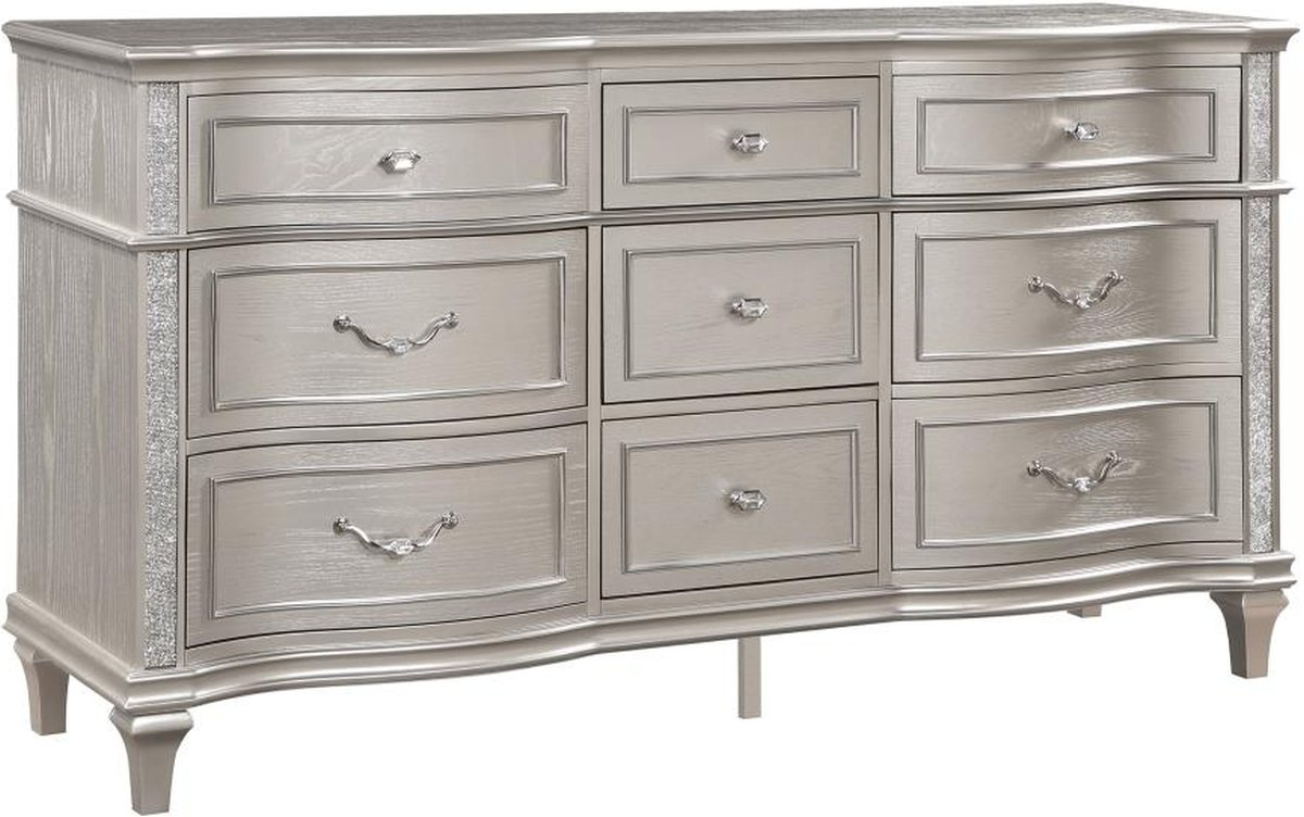 A silver oak finish creates an elegant touch to this glam nine-drawer dresser. Hexagon-shaped knobs and drop bail handles appointed with pearl accents adorn each of the nine spacious drawers for a luxurious look and feel.Read More