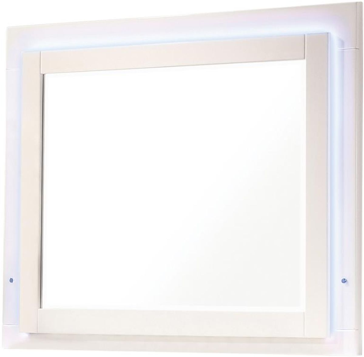 Add ambiance to a dressing area of bedroom with this modern vanity mirror. LED lighting offers a cool under glow tucked between a dual framed mirror. Covered in a polished, glossy white finish throughout, this glam mirror lends a stunning, chic display set atop a matching dresser.Read More