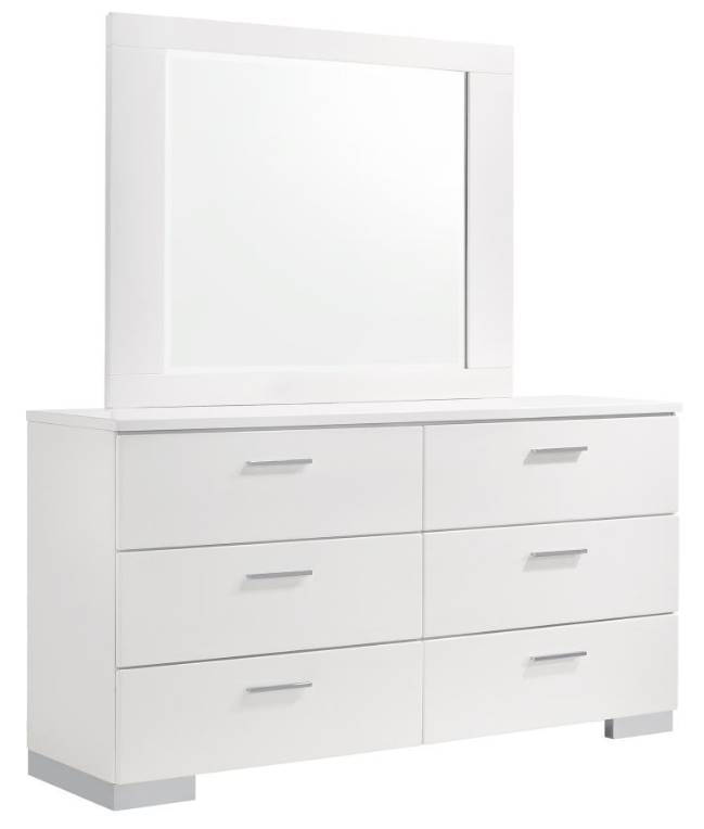 The Coaster® Felicity Glossy White Wood Dresser and Mirror offer a bright, modern look with a sleek glossy finish. Designed for both style and function, this set provides ample storage and a polished appearance that enhances any bedroom’s decor. Durable and elegant.Read More