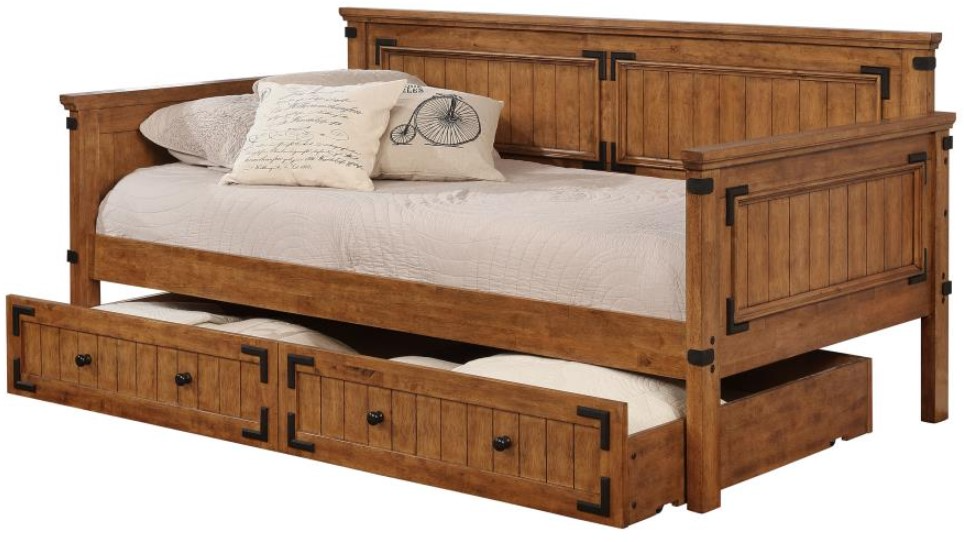 Elevate your living space with the rustic charm and versatility of this twin daybed with trundle, perfect for accommodating guests or maximizing functionality in a small space. Crafted with a solid rubberwood frame, this daybed showcases a mission-inspired design with intricate panel details and subtle metal accents, all finished in a warm rustic honey tone.Read More