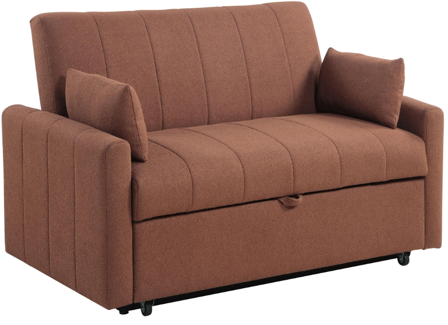 Modern sleeper sofa upholstered in luxurious reddish brown copper boucle fabric for a cozy, textured look
