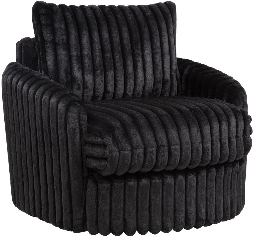 Swivel chair in black corduroy features deep channel tufting and soft sculptural shaping