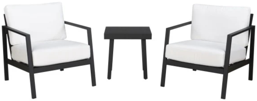 Rust-resistant aluminum frames in a black powder-coated finish ensure long-lasting performance, while the plush cushions in natural canvas Sunbrella™ fabric resist fading, stains, and mold season after season. In the supporting role, the slatted side table offers a compact and convenient surface for drinks, snacks, and decor. Whether set on a patio, balcony, or rooftop deck, this set is sure to bring new functionality and style to your space.