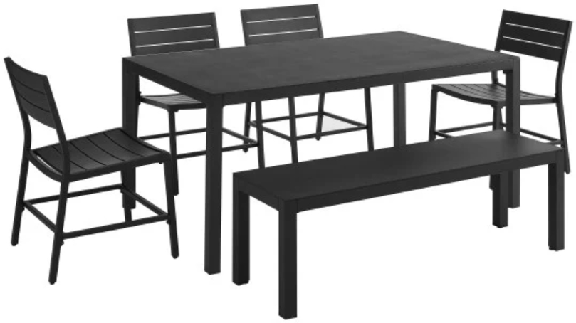 Infuse your outdoor dining area with modern style and versatility with this sleek 6-piece set. Featuring a spacious aluminum table, 4 ergonomic chairs, and a matching bench, this set presents durable construction in sleek silhouettes.Read More