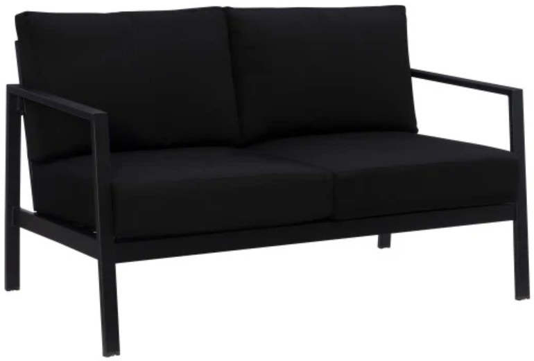 The deep foam cushions, wrapped with premium Sunbrella™ fabric in black, resist fading, stains, and mold, ensuring comfort and stress-free maintenance throughout the seasons. Compact yet inviting, this loveseat is ideal for patios, balconies, and garden nooks, providing cozy seating for two. Pair it with other pieces from the collection to create a coordinated and contemporary outdoor retreat.
