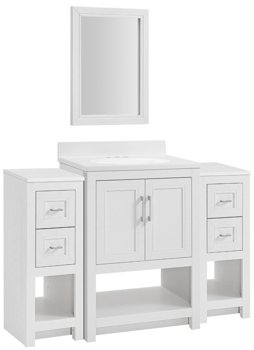 Complete Vanity Set: Includes an 18" framed mirror, a durable white one-piece countertop with sink, and pre-drilled holes for a 4" centerset faucet (sold separately). Connect the two 12" side cabinets to create a 48" wide vanity
