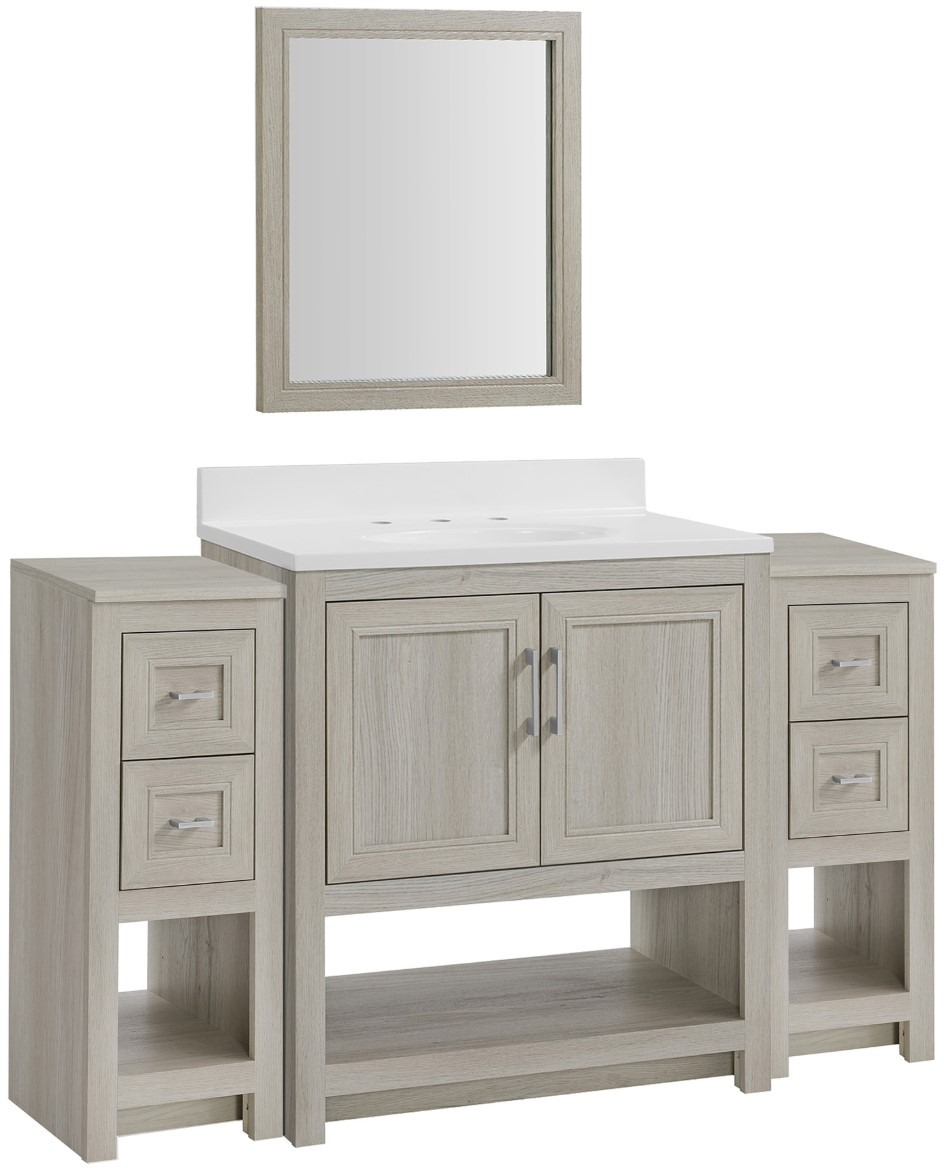 Complete Vanity Set: Includes a 24" framed mirror, a durable white one-piece countertop with sink, and pre-drilled holes for an 8" widespread faucet (sold separately). Connect two 12" side cabinets to create a 54" wide vanity