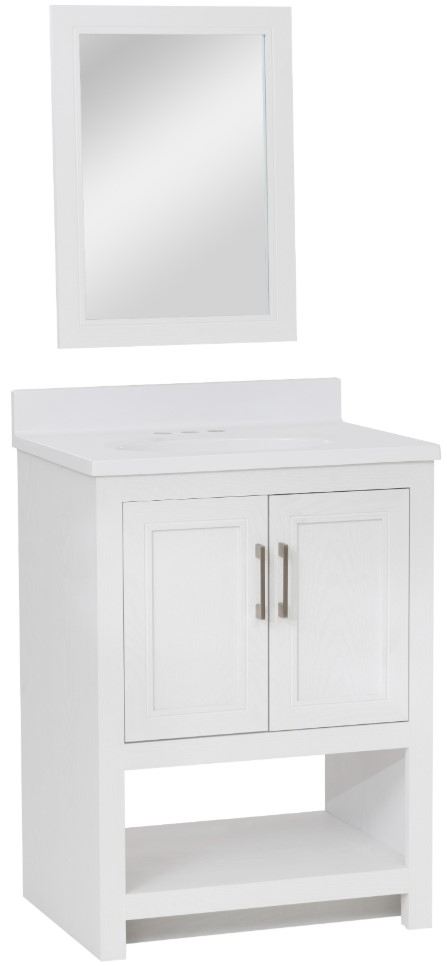 Complete Vanity Set with Mirror & Top: This elegant vanity combo includes a matching 24" wide framed mirror and a durable, white composite one-piece countertop & sink, pre-drilled for 8" widespread faucet kits (sold separately)