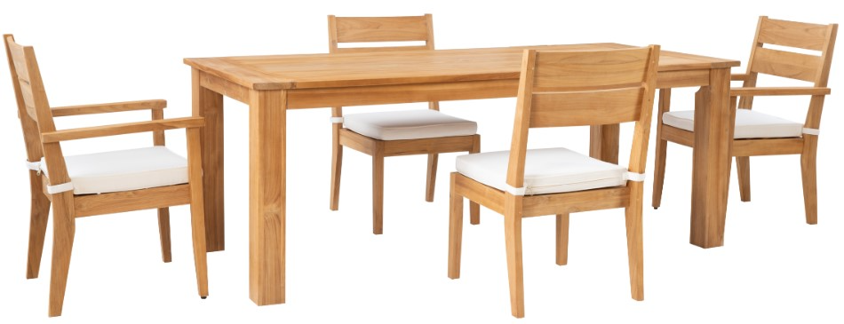 Constructed from solid teak with a natural finish, this 5-piece set brings enduring warmth and organic texture to outdoor spaces. Naturally resistant to the elements, each piece is built to withstand sun, rain, and everyday use with ease.Read More