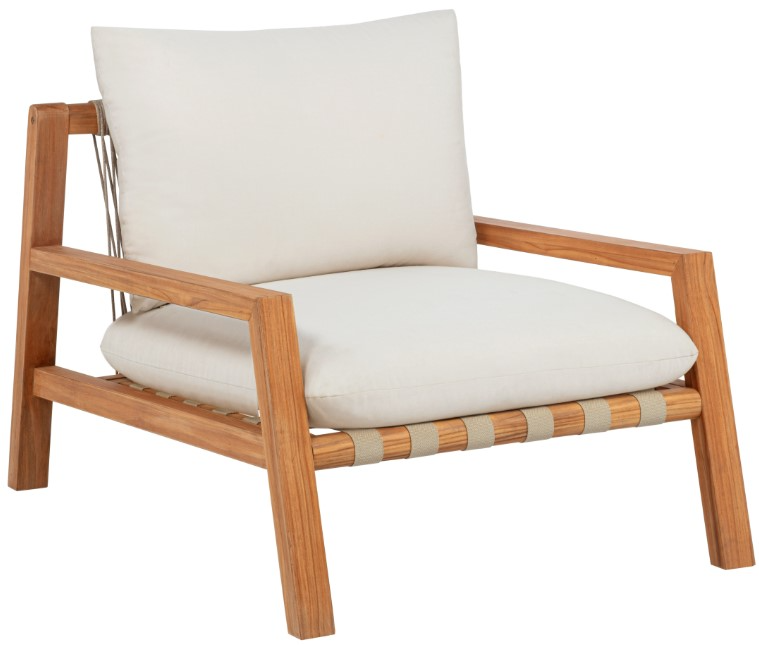 Settle in and relax with this beautifully crafted outdoor armchair, made from solid teak wood and finished with rich teak oil to bring out its natural warmth. The gently slanted back and off-white Sunbrella® cushions invite hours of lounging, while the breathable cross-hatch seat base keeps things airy and comfortable.Read More