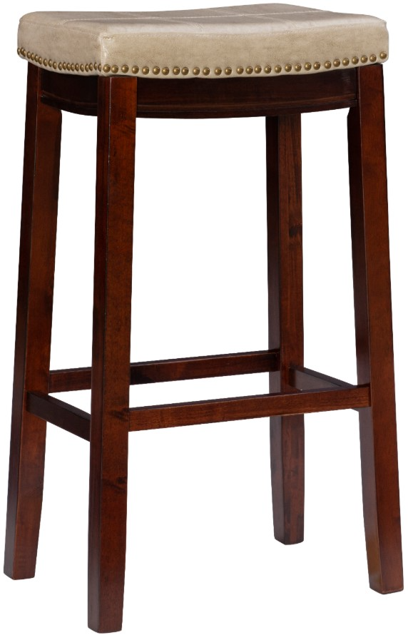 This bar stool will add stylish seating to any counter or high top table in your home. The sturdy wood frame has a dark brown finish accented by a beige faux leather seat. Antique brass nailhead trim and double needle accent stitching adds durability to the padded top for an eye catching detail.Read More