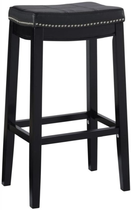 This bar stool will add stylish seating to any counter or high top table in your home. The sturdy wood frame has a black finish accented by a black faux leather seat. Silver nailhead trim and double needle accent stitching adds durability to the padded top for an eye catching detail.Read More