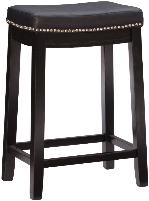 This counter stool will add stylish seating to any counter or high top table in your home. The sturdy wood frame has dark brown finish accented by a blue faux leather upholstered seat. Antique brass nailhead trim and double needle accent stitching adds durability to the padded top for an eye-catching detail.Read More