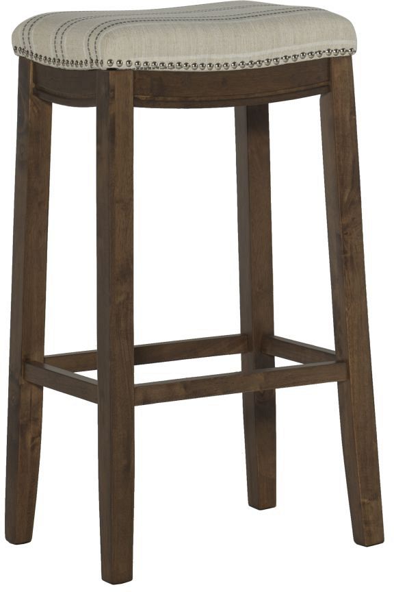 This natural linen topped bar stool will add stylish seating to any counter or high top table in your home in your home. The sturdy wood frame has a rich brown finish accented by a natural color polyester linen blend fabric seat. Brushed silver nailhead trim adds an eye catching detail.Read More