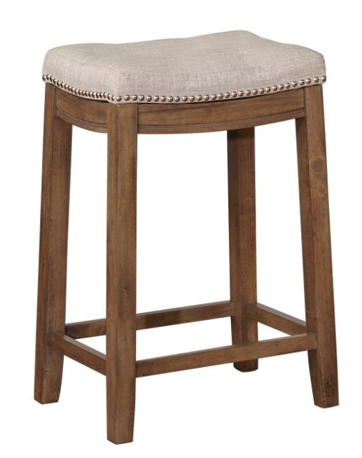 This counter stool will add stylish seating to any counter or high top table in your home. The sturdy wood frame has a rustic finish accented by a gray linen weave polyester upholstered seat. Brushed silver nailhead trim adds an eye catching detail.Read More