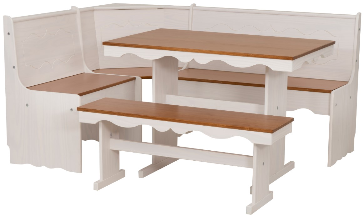 Create a cozy and charming dining space with this 3-piece corner nook bench set. Crafted from solid Elliotis pine wood in a warm caramel and crisp white paint, this set includes a reversible L-shaped bench with hidden storage, a dining bench, and a trestle-leg table—all finished with UV varnish for added protection and beauty.Read More
