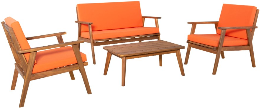 This tailored chat set is designed to be colorful, inviting and durable. Vibrant removable dark blue, grey, natural or orange cushions are made of performance fabric that resist fade and damage from the elements. The frame is built from acacia wood that is oil stained in a traditional walnut finish.Read More