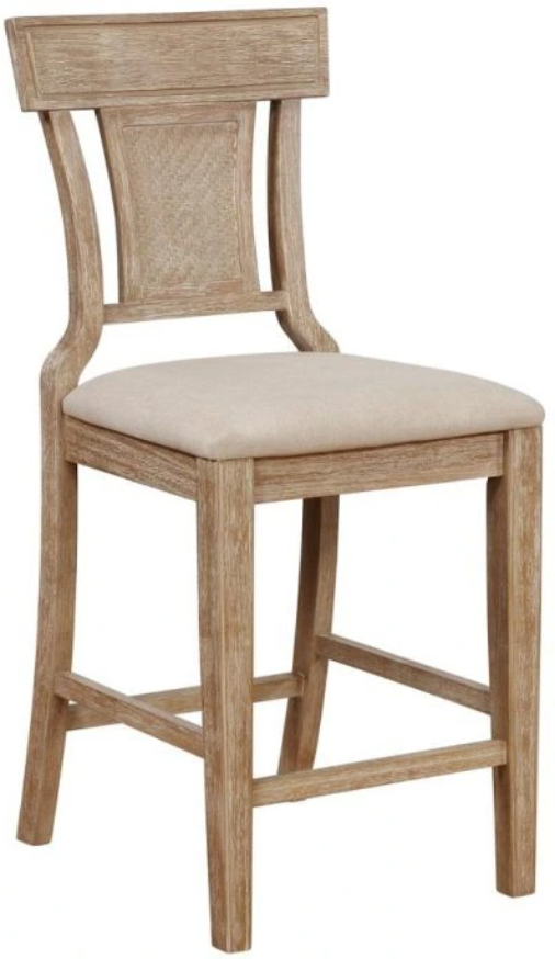 The Duncan counter stool is textured with a brown finish that is completed with a hand applied gray wash to give it a rustic and vintage appeal. The eye-catching back draws attention with its swooping sides, straight lined top rail and hand woven rattan center detail.Read More