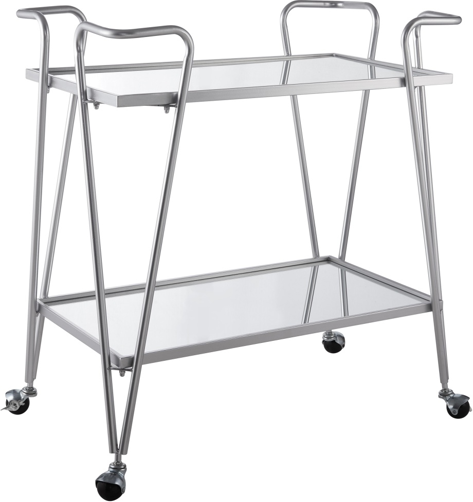 Both top and lower shelf are mirrored and framed in silver metal tray