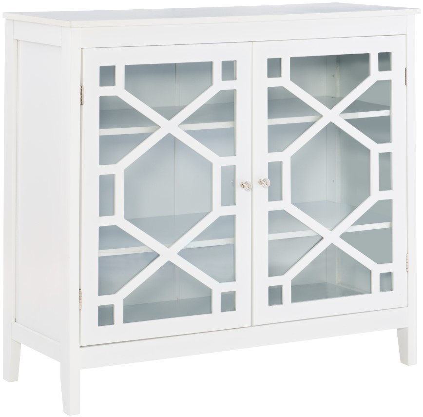 Why sacrifice style when adding storage space to your home? This lovely cabinet offers a clean-lined design in a versatile hue. The cabinet front features glass with a pane overlay and sleek silver Faux Leatherlls, which open to reveal three tiers of interior shelving space.Read More