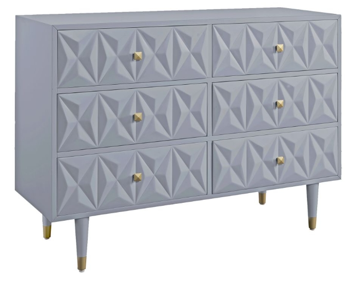 With its geometric patterned front, this geometric Gray dresser will add texture and depth to your space. The dresser has a full textured geometric front accented with square gold hardware and round, gold dipped legs. It is truly dressed to impress!Read More