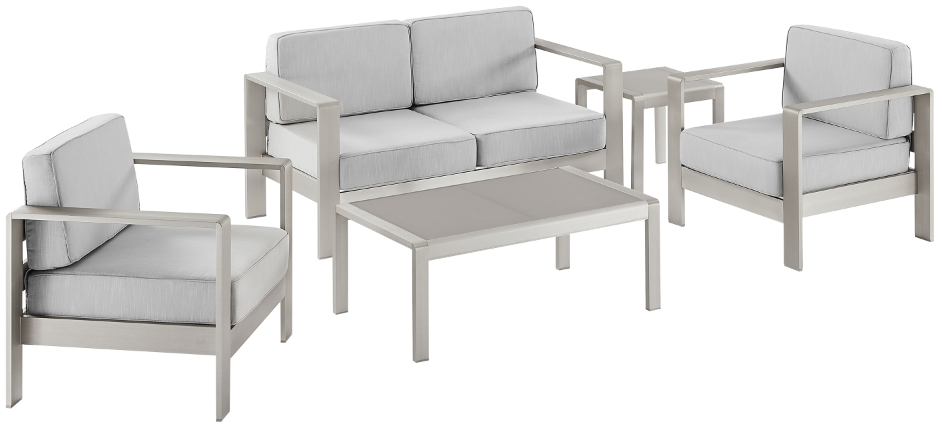 Discover your outdoor oasis with our 5 Piece Outdoor Set. The two-seater sofa and two chairs boast sleek anodized aluminum frames paired with gray polyester cushions for contemporary allure.Read More