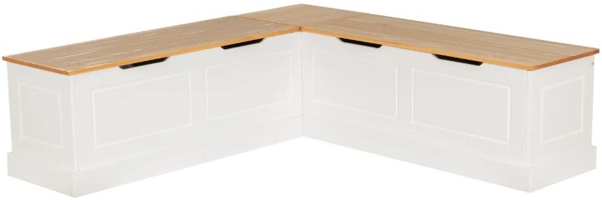 Made of solid pine, the bench tops feature a natural stain that highlights the woodgrain, while the white painted base lends a calming contrast. Lift-up seats reveal hidden storage—perfect for placemats, linens, or seasonal decor. The set ships in one box and includes a 5-piece cushion and pillow set. Solid black seat cushions are matched with two 20” x 20” pillows in buffalo and small-scale plaids, plus an 18” x 12” striped lumbar pillow. All covers have zip closures for easy removal and cleaning. A perfect blend of comfort, charm, and convenience—this set creates a welcoming backdrop for the rhythms of everyday life.