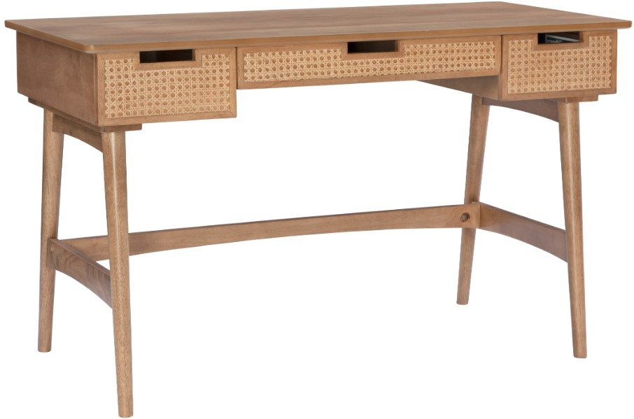 Escape the stuffiness of corporate office decor and bring new life into your home workspace with this mid-century inspired rattan desk. The top, side and back panels glow in a natural birch veneer and are complimented by 3 handwoven rattan drawer fronts with cutout handles.Read More