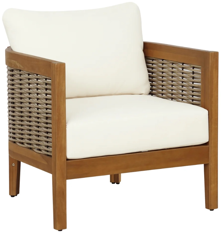 Inspired by seaside living, this club chair pairs airy textures with crisp, sun-washed tones to bring easygoing comfort in a refined silhouette. The solid acacia wood frame is accented by faux rattan wicker panels and finished in a natural stain for a soft, earthy look.Read More