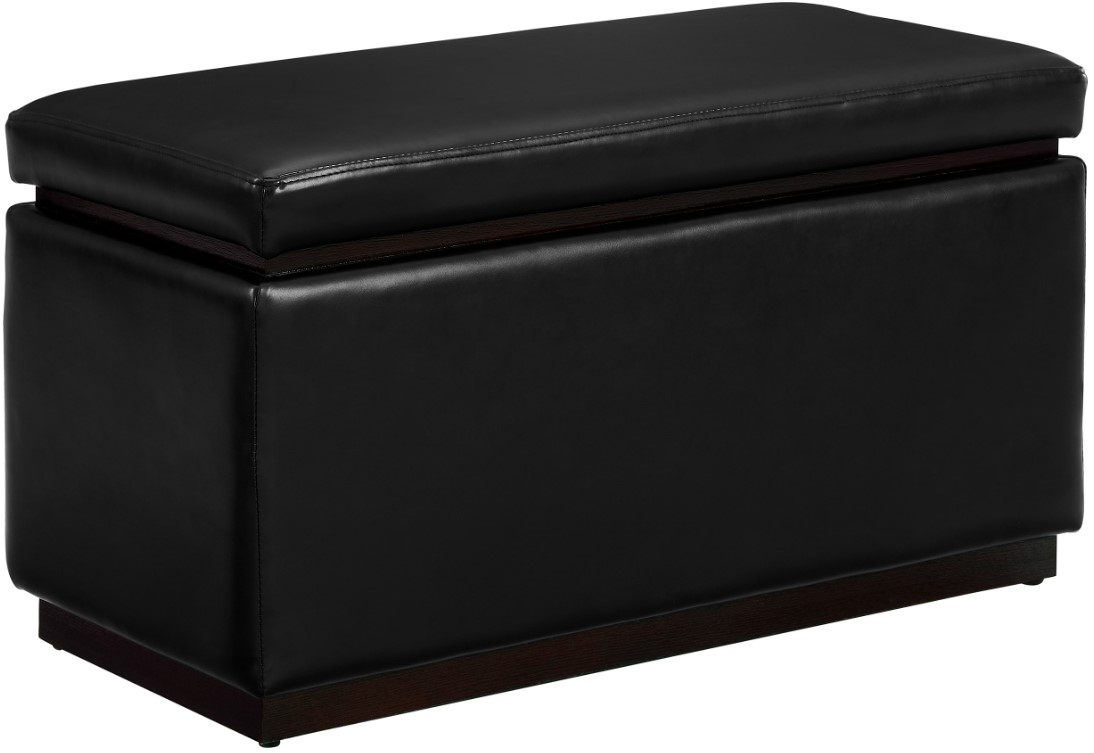 Out of sight storage, style, and comfort come together as one to form this versatile ottoman. The padded exterior is upholstered in black faux leather, offering a welcoming seat or footstool for two to kick up their feet without overcrowding.Read More