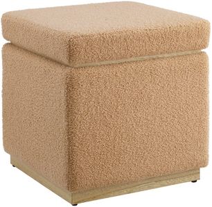 Soft sherpa boucle upholstery in tan, covers the wooden frame and removable lid, while the interior is lined with black nylon fabric. Natural pinewood trim offers a subtle accent that adds to a refined aesthetic. This ottoman is great for maximizing space in your home and contributes to a welcoming and clutter-free environment.