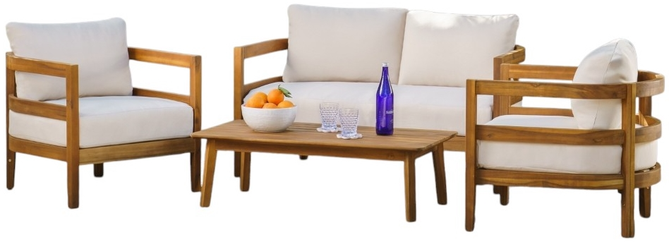 Framed in solid acacia wood with a warm natural finish, this 4-piece outdoor set brings tailored comfort to patios, porches, and garden lounges alike. The ensemble includes a slatted cocktail table, plush loveseat, and 2 club chairs—each featuring clean lines and sculpted ladder-back details for a midcentury look that feels open yet grounded.Read More