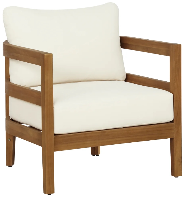 With its curved frame and low profile, this club chair makes for a clever statement piece in any outdoor setup. The solid acacia wood base features rounded ladder-back rails in a warm teak-toned finish for a sculpted midcentury barrel look.Read More