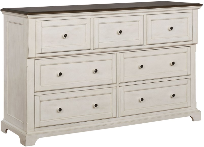 The Vintage Estates Dresser provides multiple storage spaces with three top drawers and four large drawers. The top drawers use one knob in the middle and the bottom drawers use two knobs for ease of access. This dresser can be paired with the Vintage Estates Mirror.Read More